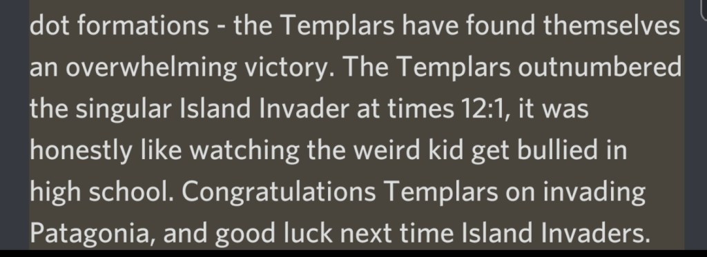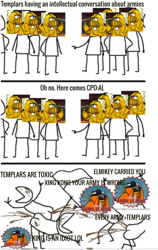 Biggest March on Oasis (before the Imperial Age) ~ Circa August 2018Templars stating facts HahahahaTemplar Movement to #PurgetheFurryChickens Have Fur Meme ~ Circa March 3rd 2020The Rise of Smurt Bernie ~ Circa May 2020Brownpen Coming Out (jk not actually, just a joke)Battle of Ice Box ~ Circa November 30th 2019Basedball being basedball ~ Circa November 30th 2019 (Battle of Glacier vs EGCP)Templar Legend Davearcher57, the man we lost in the wars against EGCP ~ January 12, 2019 Xing’s Love ~ Early 2019Invasion of Creme Soda (1st Invasion) vs Royal Family and Wild Ninjas ~ April 27th, 2019(meme made after templars was banned from CPO while fighting Help Force) Circa. Mid 201911 Step Templar Plan to Win war against Help Force and Pirates ~ June 20th 2019Banana admiting horrid things on Templar’s Recruiting Alt (Rip Micderpers Alt)Templars Destroying Rythm Queues, Hitting 35 and a 1/2 hours. ~ Circa Summer 2019Hes been here for 5 gays I think ~ Circa 2019Confused Pen. ~April 19th 2020 (RAC Russia Server)ok.Every 30 moms. K got it. Xing Marries Himself ~ Circa: Early 2020Xings Club Penguin Wedding Mythic Being an AutistXing Drinks Piss lolololGaydomist the FirstFeels Bad nglThe Perfect Match…well almost…Gaydomist 2.0????????? Ignore the top part just focus on the bottomAnd they’ll never know… ~August 11th 2019Greatest Emperor by far It’s all TrueBe Useful or no Heaven the best username ever made.heis retardedXing’s true Identification a man true to his wordsTemplars, the TRUE victors of the Fjord Frenzy Tournament ~ Circa February 22nd 2020Just 1 Month 8 days leftClassic Meme. LolStill Waiting @bonelessThe funeral was a joyous occasion #CPAHISCORRUPT #FREEXINGOver 50% of cpa is over 17 or over? Wtf go outside Templar Autism Shitpost Division [TASD] raid on CANC Toy Soldier Video. Circa November 2020The Return of Brownpen (after Cobras Coup) ~ November 6th 2020Brownpen Baiting the Baiter, SummitThe End of Global Chat 1 War [Outside Jerusalem] ~Circa October- November 2020