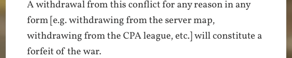1B: Next, let’s look at the real declarations against SWAT. Looking at IW, TCP, HF, and WVs war post (reference 2-5) in all 4, it says “A withdrawal from this conflict for any reason and in any shape or form” thus making this a breakage of term number 9/10 (depending on which post). As SWAT intelligibly chose to surrender from the war in their own post (reference 6). This is a rule breakage and will be talked amongst CPA Admins and all parties included.
