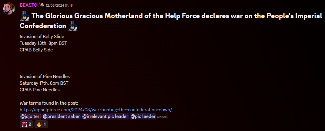 If you’ve observed the CPA community for the past several years, you may have noticed a pattern developing with Help Force. HF’s last big conflicts until now were with Silver Empire in 2021 and SWAT in 2022, armies that barely classified as major and surely served as an easy target. The Force waited THREE ENTIRE YEARS only to declare war on PIC, a freshly major army that just faced two significant leadership resignations. PIC was openly attempting to leave to map and was clearly in a state of recovery. Using this as their first war to break isolation is frankly shameful., especially when so many other options were available to them
