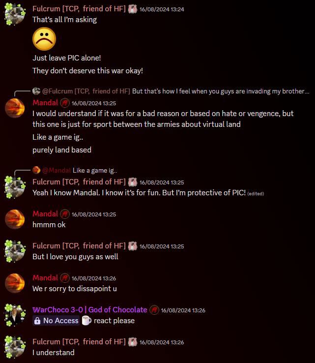 As you can see from the above screenshot from HF’s Discord, Elsa spoke very kindly once it was clarified that the war was not personal. She backed off and offered her support, even going as far as to state her love for HF. Elp responded to this immediately with a mute, telling her to get lost and adding “we could take to extend the war to you too”. Threats towards us or our members will always be addressed, and we will crush your army in response.